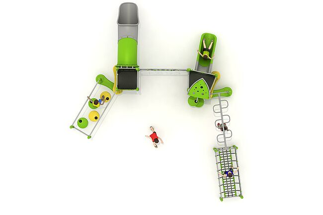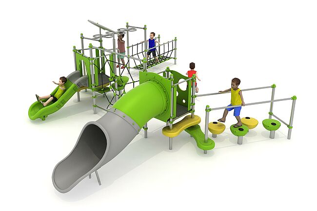 Structure d'équilibreStructure de grimpeDisques à grimperEchelle horizontaleFilet araignéemarche d'accèsPas de géantsPont filetToboggan tunnel