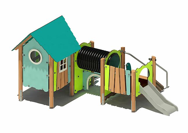 CabaneBancsEscalierPanneaux ludiquesPlan incliné d'escaladeTunnelToboggan