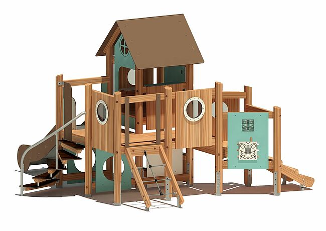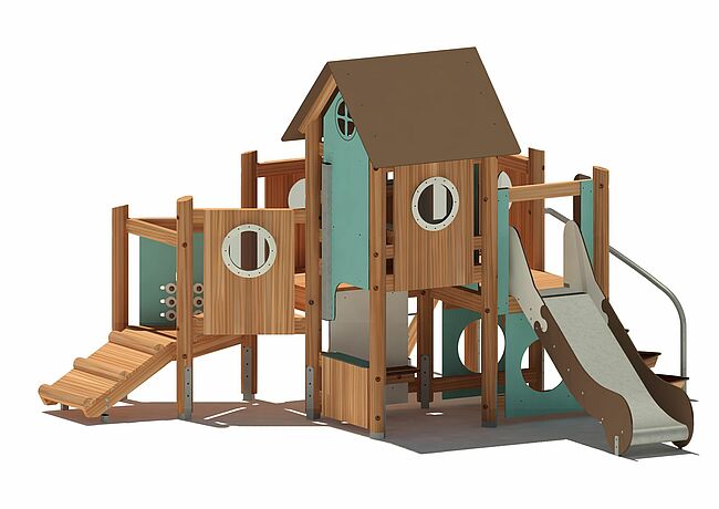 CabaneBancsComptoirEscalier transfertFilet InclinéEscalierPanneaux ludiquesPlan incliné d'escaladeToboggan